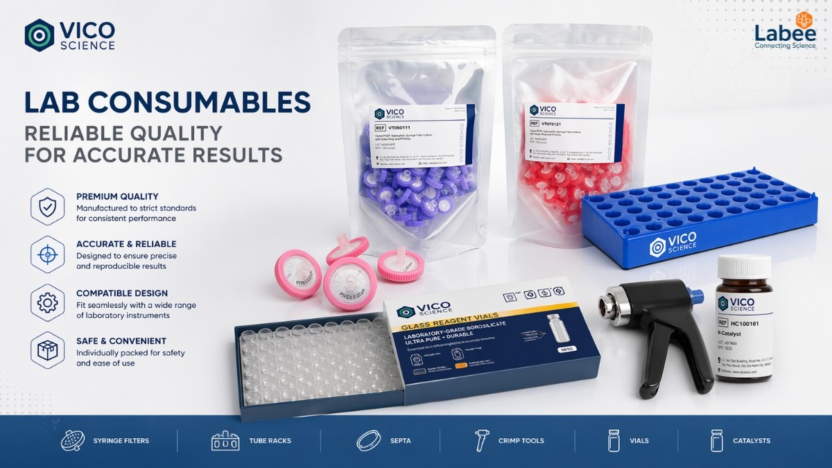 Thương hiệu Vico Science (liên kết chiến lược cùng ALWSCI) là nhà sản xuất vật tư tiêu hao sắc ký (Vial, Septa, Filter) chuẩn quốc tế. Phân phối độc quyền bởi Labee, thương hiệu Vico Science giải quyết triệt để vấn đề nhiễu nền sắc ký, tối ưu hóa chi phí vận hành và đáp ứng nghiêm ngặt tiêu chuẩn GLP/ISO 17025.